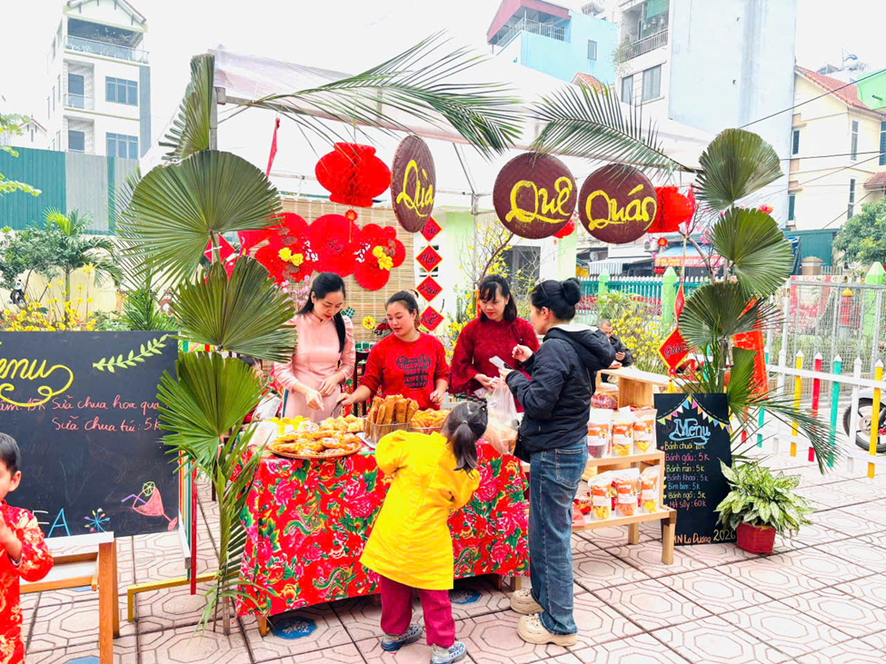 Cả sân trường ngập tràn trong sắc đỏ, cờ hoa, tấp lập với các gian hàng trưng bày, khu trải nghiệm. Bé nào cũng háo hức vui tươi khi được tham gia hội chợ cùng bố mẹ, và người thân. Không chỉ được vui chơi trải nghiệm, bé nào cũng có những phần quà nhỏ mang về đó là những chiếc bánh chưng xinh xắn, mang đậm hương vị của ngày Tết.